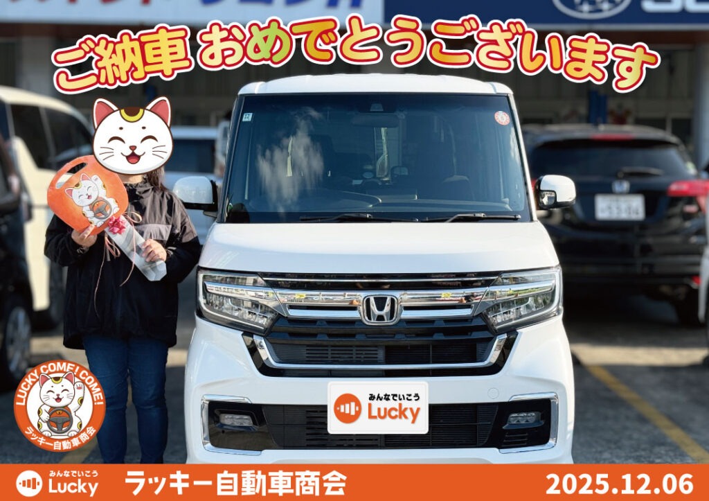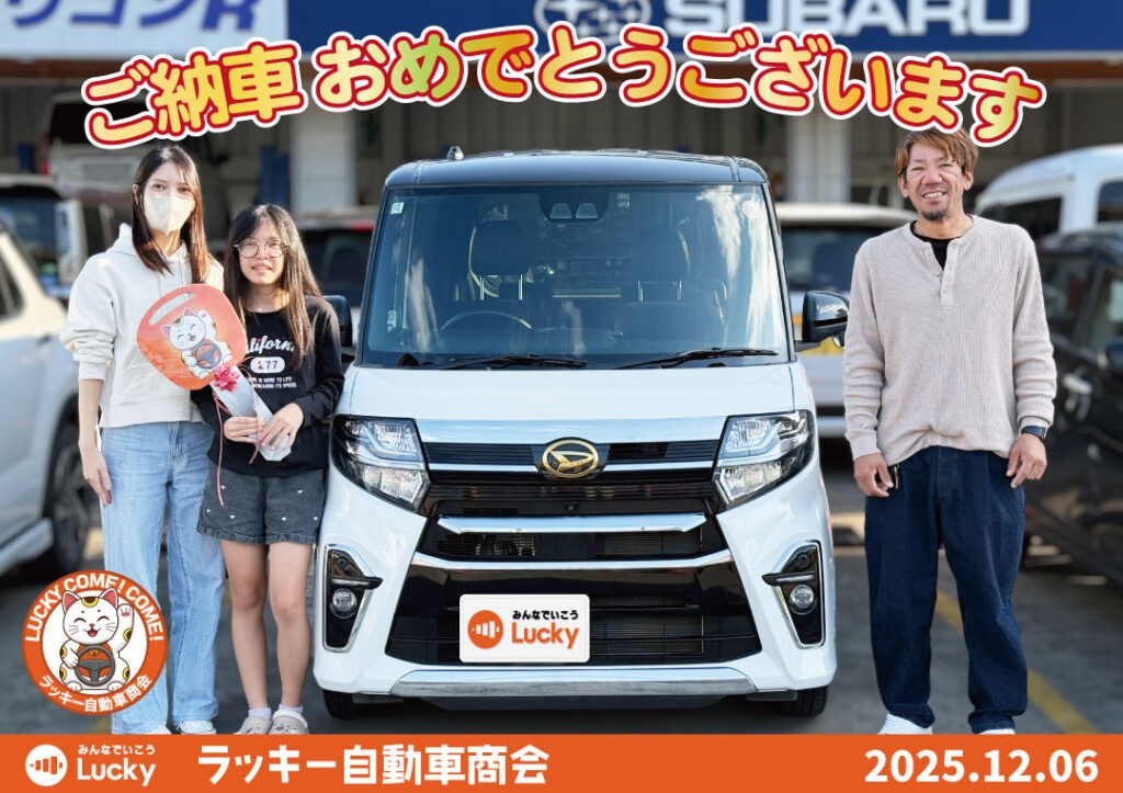 トップページ 2024.12.102025.09.08 NEWS・EVENT 新着情報 ラッキーからのお知らせ 月間スケジュール 2025.12.272026.02.03 グループ各店舗の営業日と電話受付時間 2025.09.172025.12.25 中古車入荷情報 2025.12.242025.12.25 事業拡大のため人材募集 2025.12.25 車パーツ販売 2025.12.13 スタッフブログ 寒ければ脇は結構暖房 2026.01.14 漢が集まると密度熱が半ハンパない! 2025.12.23 寒くて漢の笑顔を忘れがち 2025.12.05 車検・定期点検・板金・修理・オイル交換等のご予約はこちらから ラッキー自動車商会の経営理念と会社概要について 沖縄県内初の格安スピード25分車検システムClear25民間車検工場 ラッキー自動車商会のLINE公式アカウントで様々なご相談に対応いたします 事故・故障時は保険会社の前に自動車救急隊へご連絡ください キズヘコミやリペア修理専門の本店第1板金塗装工場と保険事故を専門とする第2板金塗装工場 ラッキー自動車商会では一緒に働いてくれるスタッフを募集しています TV-CMでもお馴染みの楽喜家の紹介と過去のCMライブラリー ご納車おめでとうございます! 2025年12月6日 名護市のH様 タント納車 2025年12月6日 南風原町のT様 N-BOX納車 2025年12月4日 那覇市のN様 アルト納車 2025年12月4日 糸満市のT様 ジムニー納車 2025年10月11日 豊見城市のT様 スイフト納車 過去の納車式はこちらから Instagram 広報 ラッキー自動車商会、工場の2月のスケジュールです。 赤色の日はお休みとなっております。 2025年12月6日 名護市のH様 タント ご納車おめでとうございます! #納車式 2025年12月6日 南風原町のT様 N-BOX ご納車おめでとうございます! #納車式 2025年12月4日 那覇市のN様 アルト ご納車おめでとうございます! #納車式 さらに読み込む Instagram でフォロー Instagram 販売スタッフ 新型キャリートラック!展示中です! 顔がカッコよくなって 安全性能が良くなってます! #ラッキー スペーシアカスタムハイブリッドXS 人気者のハイグレード! #中古車 #suzuki #スペーシ (こども100番の家) こんにちは ラッキー自動車商会の上里です 今日は宮平店長に代わり当店の活動の 期間限定で注文再開です! お早めに! #ジムニーノマド #注文開始 #抽選 #ラッキー自動車商会 さらに読み込む Instagram でフォロー YouTube 広報 今日の特選車 #アクア #ラッキー自動車商会 ヴォクシーZS #中古車 #ラッキー自動車商会 TikTok 広報 @luckycarpr