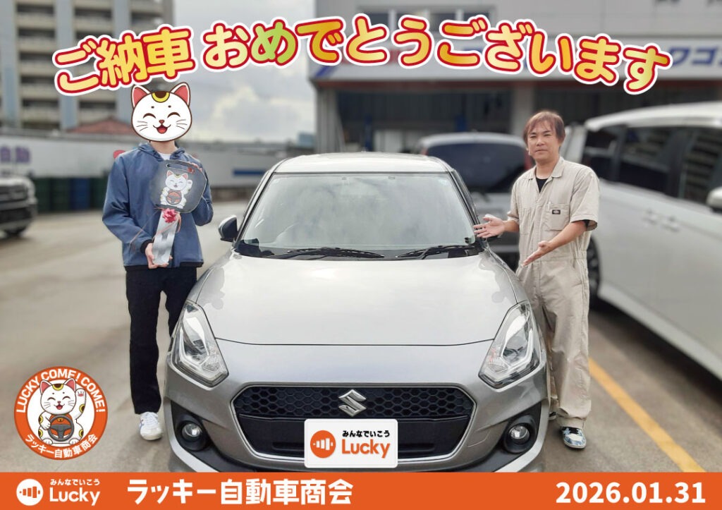 トップページ 2024.12.102025.09.08 NEWS・EVENT 新着情報 ラッキーからのお知らせ 月間スケジュール 2025.12.272026.03.31 グループ各店舗の営業日と電話受付時間 2025.09.172025.12.25 中古車入荷情報 2025.12.242025.12.25 事業拡大のため人材募集 2025.12.25 車パーツ販売 2025.12.13 スタッフブログ ナイスミドル!珈琲は甘くても微糖で!! 2026.03.20 コーティング施工は漢の腕試し 2026.02.08 寒ければ脇は結構暖房 2026.01.14 車検・定期点検・板金・修理・オイル交換等のご予約はこちらから ラッキー自動車商会の経営理念と会社概要について 沖縄県内初の格安スピード25分車検システムClear25民間車検工場 ラッキー自動車商会のLINE公式アカウントで様々なご相談に対応いたします 事故・故障時は保険会社の前に自動車救急隊へご連絡ください キズヘコミやリペア修理専門の本店第1板金塗装工場と保険事故を専門とする第2板金塗装工場 ラッキー自動車商会では一緒に働いてくれるスタッフを募集しています TV-CMでもお馴染みの楽喜家の紹介と過去のCMライブラリー ご納車おめでとうございます! 2026年1月31日 糸満市のA様 スイフト納車 2026年1月30日 南城市のY様 ハイゼットジャンボ納車 2026年1月27日 豊見城市のI様 ムーヴ納車 2026年1月25日 南風原町のS様 ヴォクシー納車 2025年12月27日 糸満市のO様 スペーシア納車 過去の納車式はこちらから Instagram 広報 2026年1月31日 糸満市のA様 スイフト ご納車おめでとうございます! #納車式 2026年1月30日 南城市のY様 ハイゼットジャンボ ご納車おめでとうございます! #納車式 人気のハリアー続々入荷してます! #中古車 #ハリアー #ラッキー自動車商会 ラッキー自動車紹介では年に一度の大決算フェアを開催中ですが、大好評につき4月30日まで延長決定となり さらに読み込む Instagram でフォロー Instagram 販売スタッフ じょーとーハリアー何台か入庫してます! 下取り10万円保証も延長中!お早めに! #ラッキー自動車 今月末まで延長決定! どんな車でも下取り10万円! #ラッキー自動車商会 #中古車販売 #カース すっぽり😊 #ラッキー自動車商会 #中古車販売 #くーろー #ねこ はいさーい 店長のさとにーデス! 沖縄で損保代車やレンタカーが必要な時はエールレンタカー沖縄をよろし さらに読み込む Instagram でフォロー YouTube 広報 今日の特選車 #アクア #ラッキー自動車商会 ヴォクシーZS #中古車 #ラッキー自動車商会 TikTok 広報 @luckycarpr