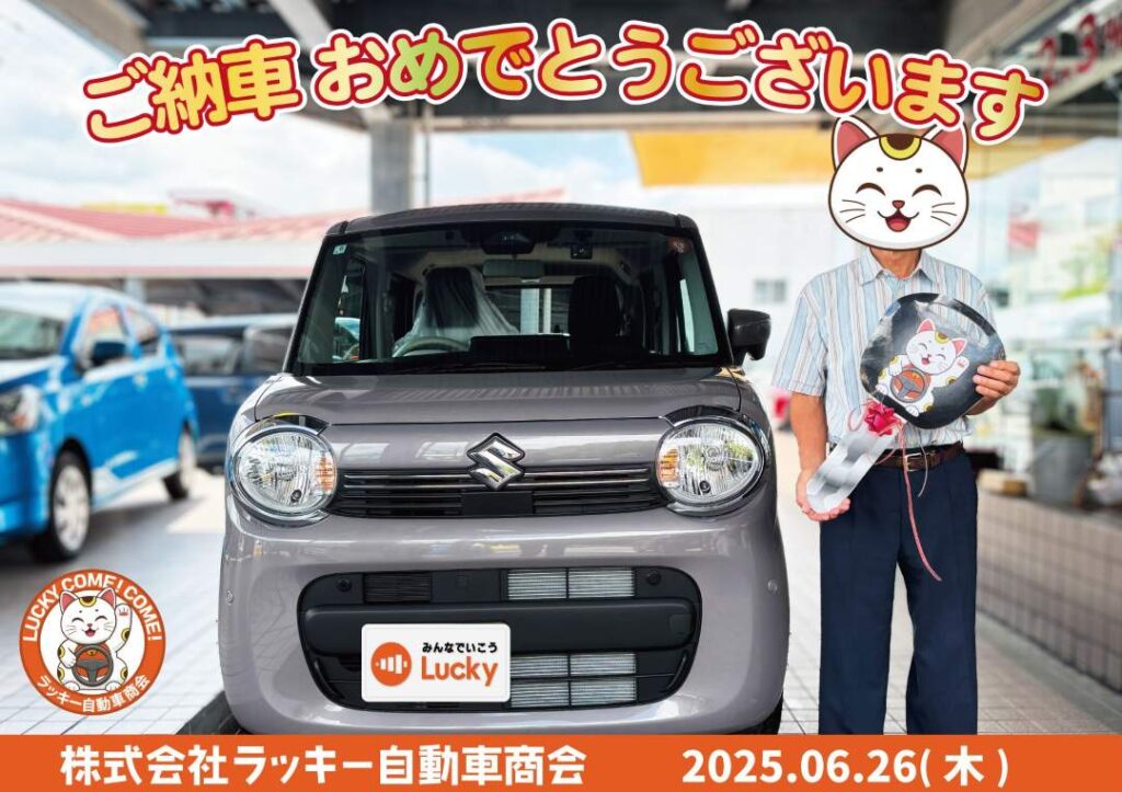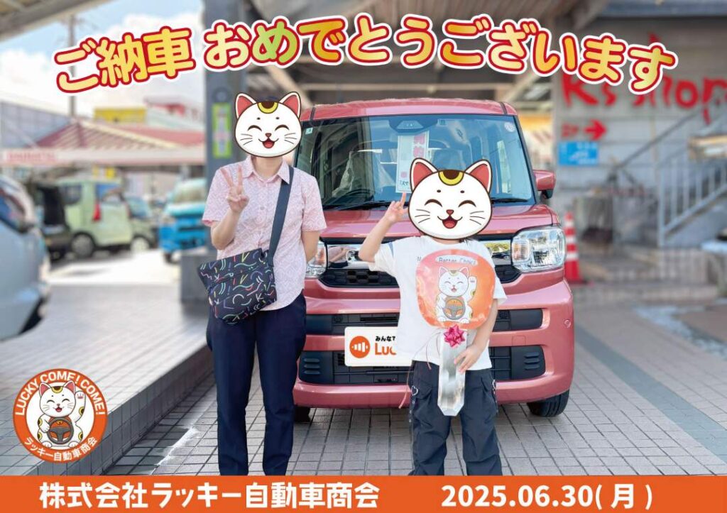 納車式2025年6月 納車式 2025.12.132025.12.16 2025年6月25日(水)浦添市のO様 ハイゼット納車 2025年6月26日(木)八重瀬町のM様 ワゴンRスマイル納車 2025年6月30日(月)南風原町のN様 スペーシア納車 各種SNSのフォローよろしくお願いします